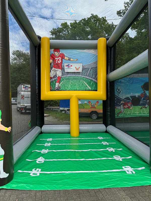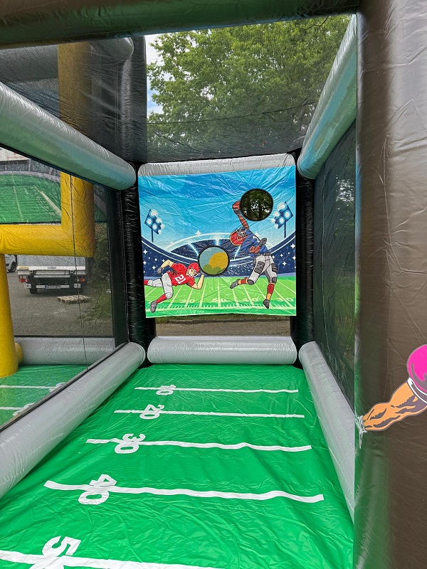 Hier werden direkt zwei Bewegungsabläufe des Footballs gefordert. Links wird das Field Goal trainiert (gezielter Kick durch die Torstangen), rechts wird der Ball durch die vorhandenen Löcher geworfen. Riesiger Spaß für Football Fans und alle, die es werden wollen.
