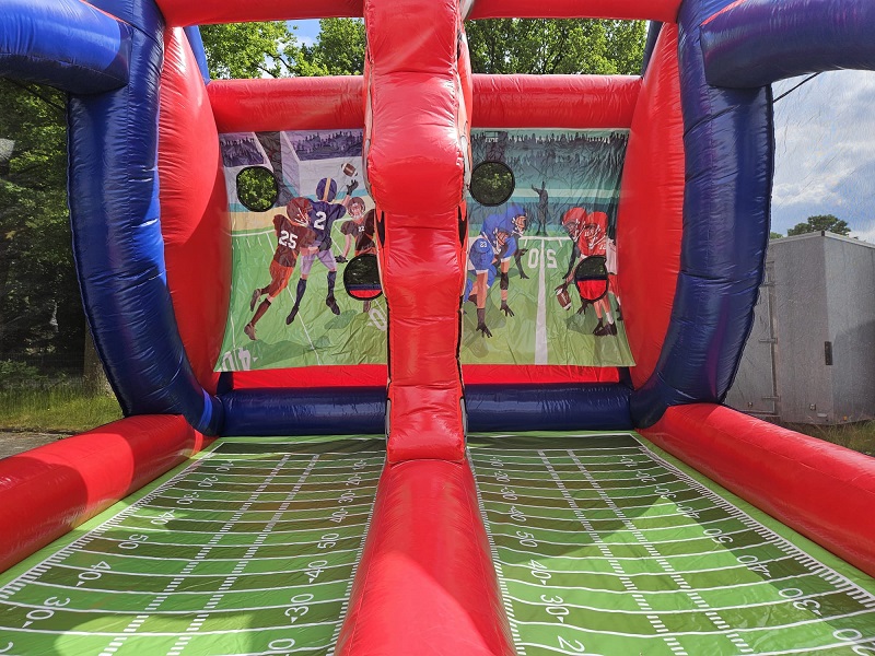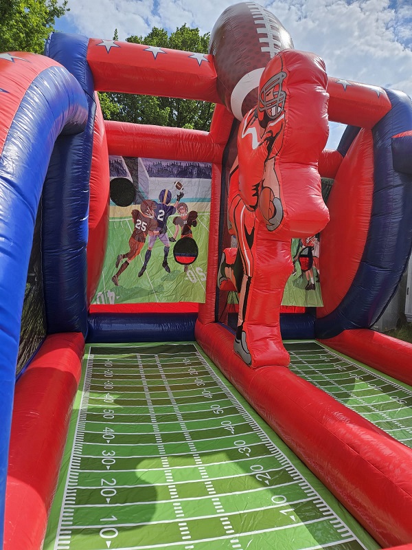 Zeig deine Wurfkünste mit dem Football und fordere Freude und Familie zum direkten Duell heraus! Je Bahn steht ein Ball zur Verfügung, der durch die hinten liegenden Löcher geworfen werden muss. Nach jedem Wurf rollt der Ball über die Plane zurück zum Werfer, sodass direkt erneut gezielt werden kann. Wer nach einer vorher festgelegten Zeit mehr Treffer erzielt hat, gewinnt.
