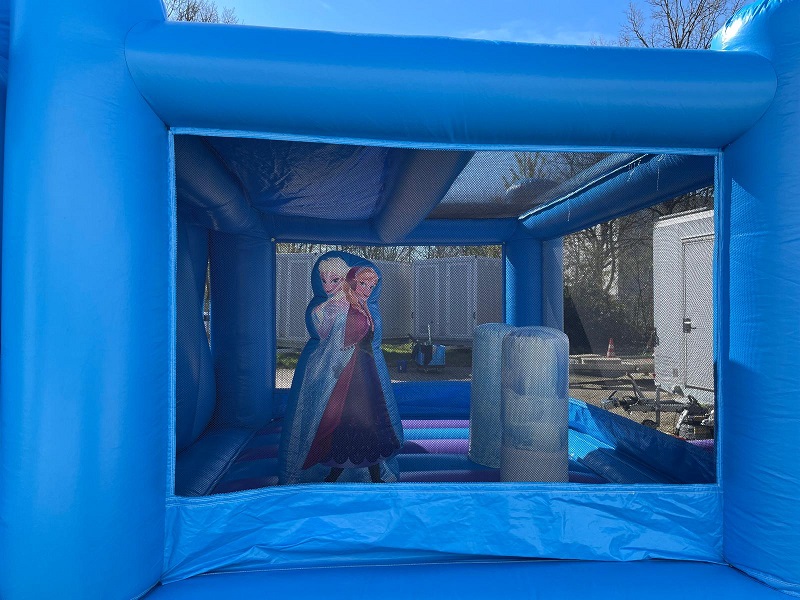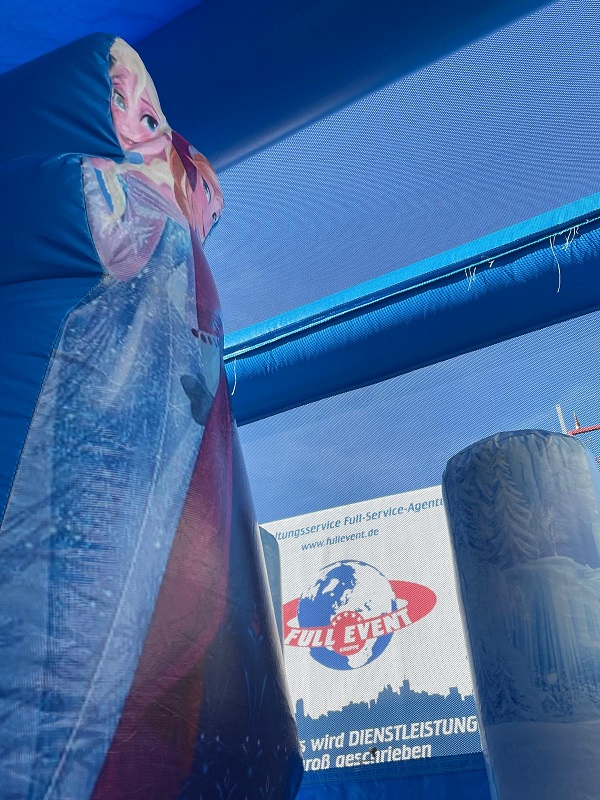 Herzlich Willkommen in der winterlichen Welt von Elsa, Anna Co! Die allseits beliebten Disney-Helden um Olaf, den liebenswerten Schneemann begrüßen Ihre Kleinen am Tor der Frozen-Hüpfburg. An Rentier Sven vorbei geht es auf die Hüpffläche, auf der sich die kleinen Eisköniginnen und –könige nach Herzenslust austoben können. Eine durchgehende Umrandung macht das winterliche Königreich absolut sicher.